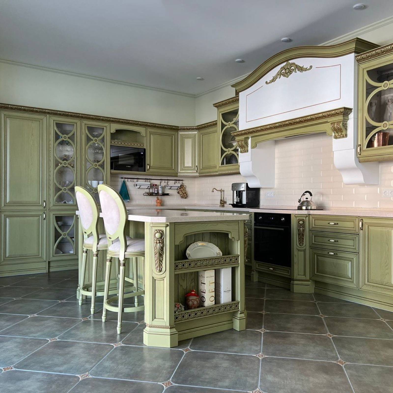 Кухня оливкового цвета может быть выполнена в разных стилях. Такой гарнитур будет гармонировать с классикой, барокко, как на нашем фото, минимализмом, хай-теком, модерном, провансом и кантри — есть много вариантов дизайна кухни. Пример классического оформления на фото ниже.